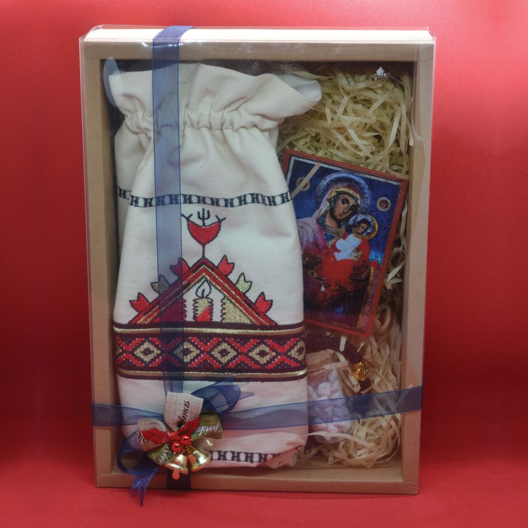Составен дел од подарокот е малата торба со мотив од носија од Скопската околија со вез на запалена свеќа, во црвено -златни нишки.